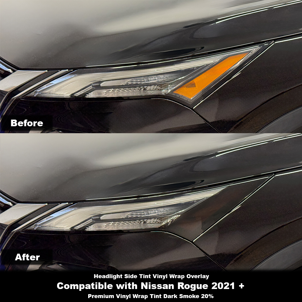 Elevate the aesthetic appeal of your Nissan Rogue with the Crux Motorsports Headlight Side Tint Vinyl Overlays in Dark Smoke 20% Engineered for a precise, factory-quality fit, these overlays provide a refined, smoke appearance. Utilizing air-release vinyl wrap technology for a bubble-free installation—no more wet mess from slip solutions