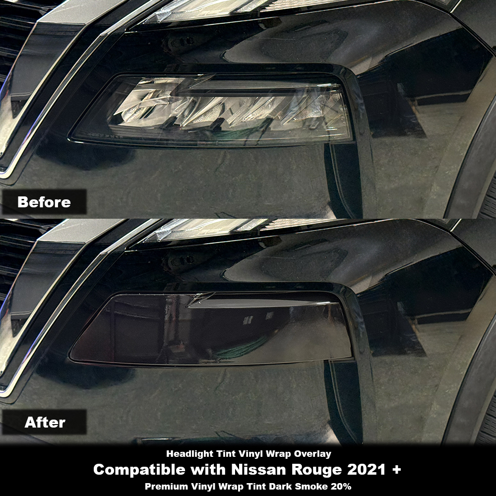 Elevate the aesthetic appeal of your Nissan Rogue with the Crux Motorsports Headlight Tint Vinyl Overlays in Dark Smoke 20% Engineered for a precise, factory-quality fit, these overlays provide a refined, smoked appearance. Utilizing air-release vinyl wrap technology for a bubble-free installation—no more wet mess from slip solutions
